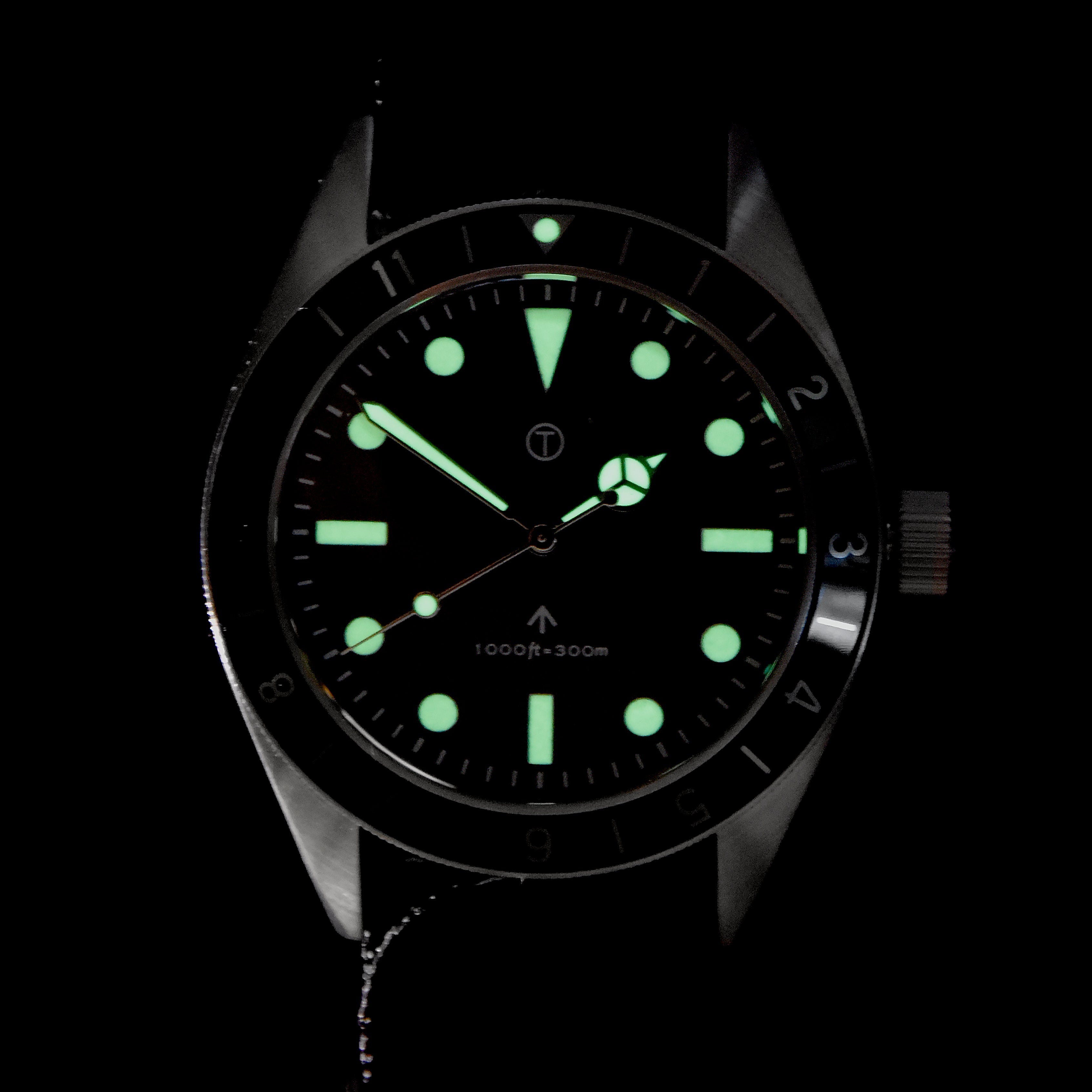 For historical accuracy, the watch dial retains the encircled "T" marking, a nod to the Tritium-lumed military watches of the past.